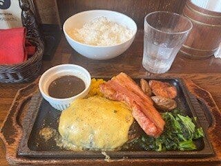 注文したハンバーグは、ベーコン+チーズトッピングのわんぱくセットです。